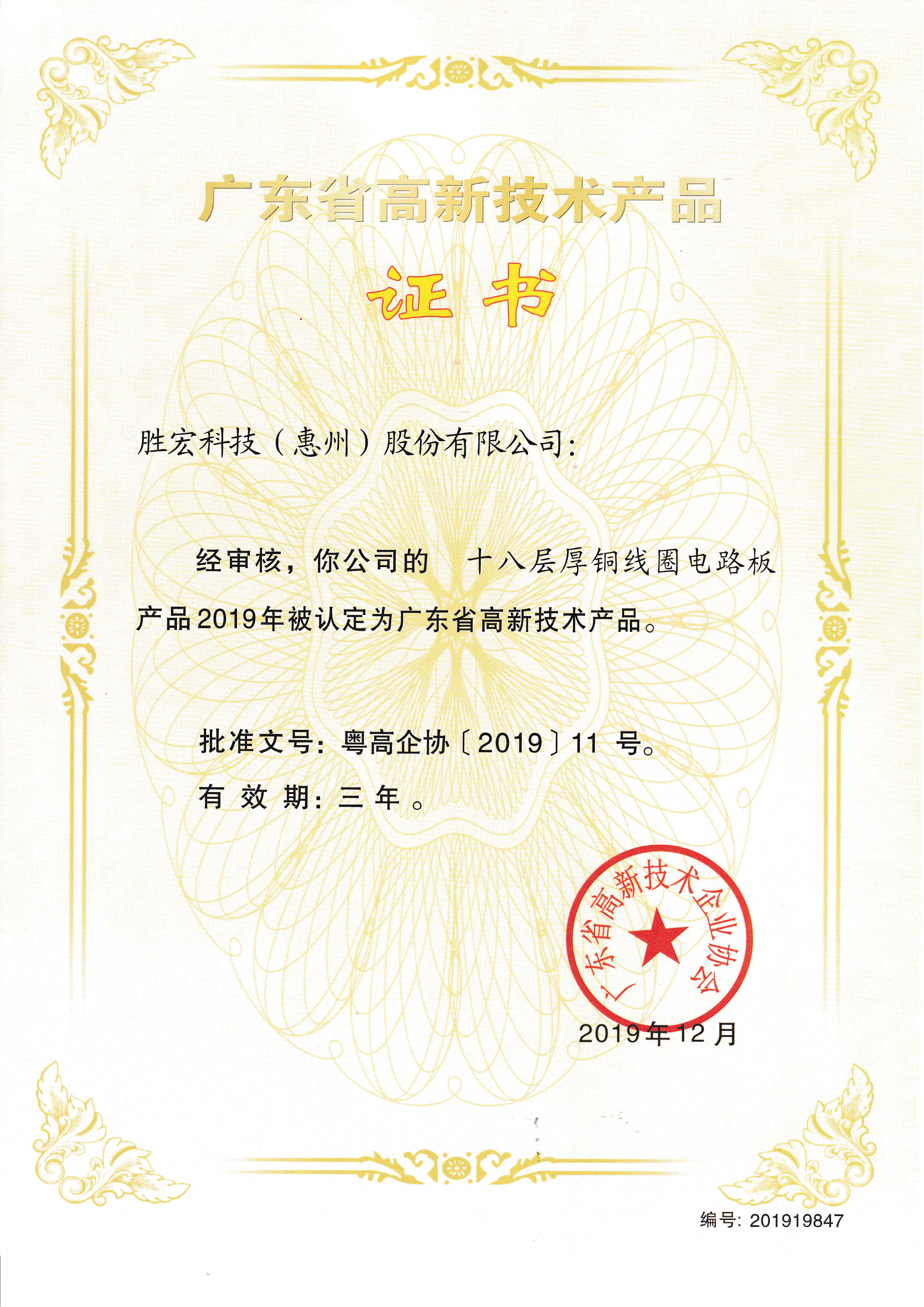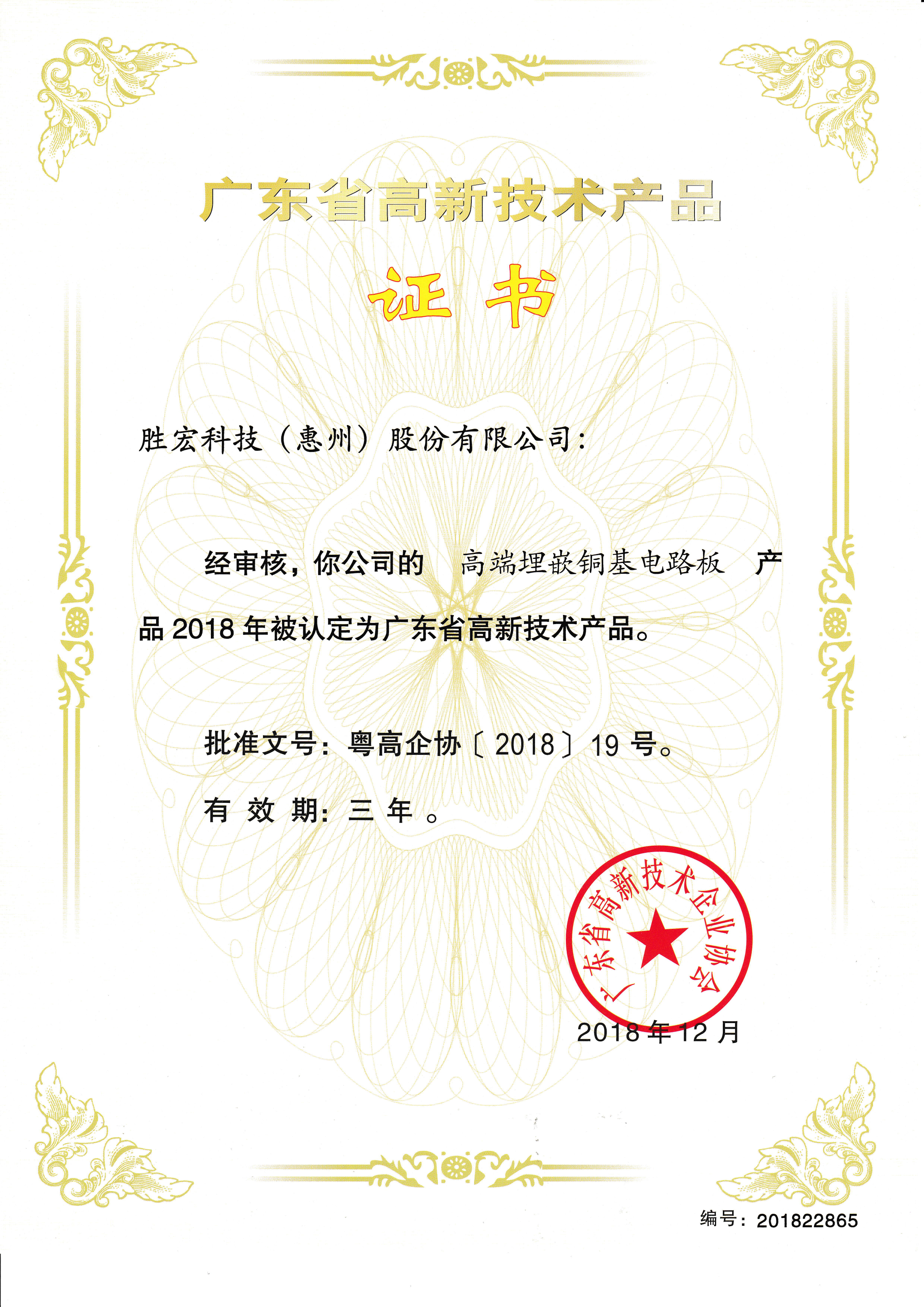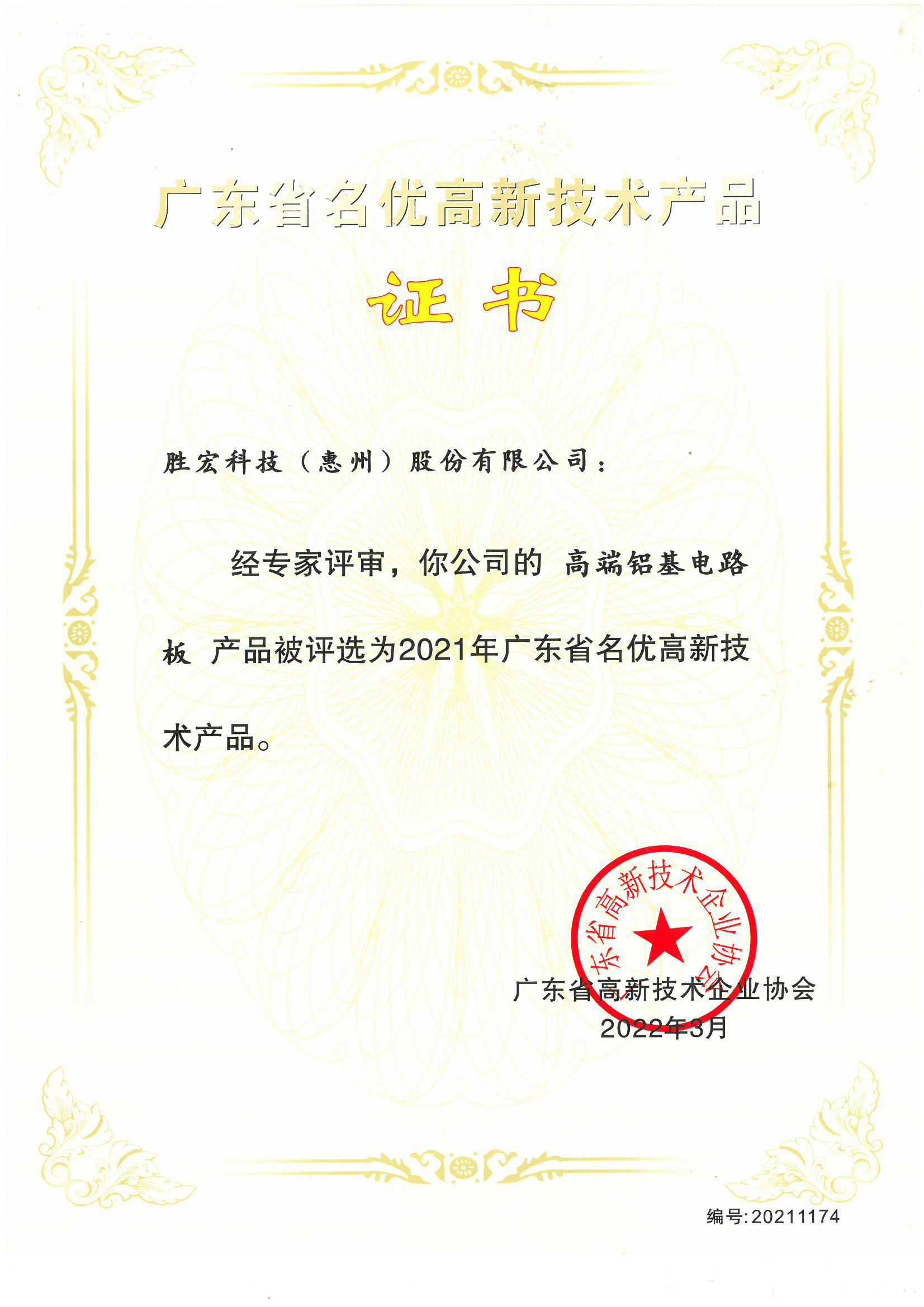 「ハイエンドアルミニウムベースプリント基板」中国広東省の名優高新技術製品証明書