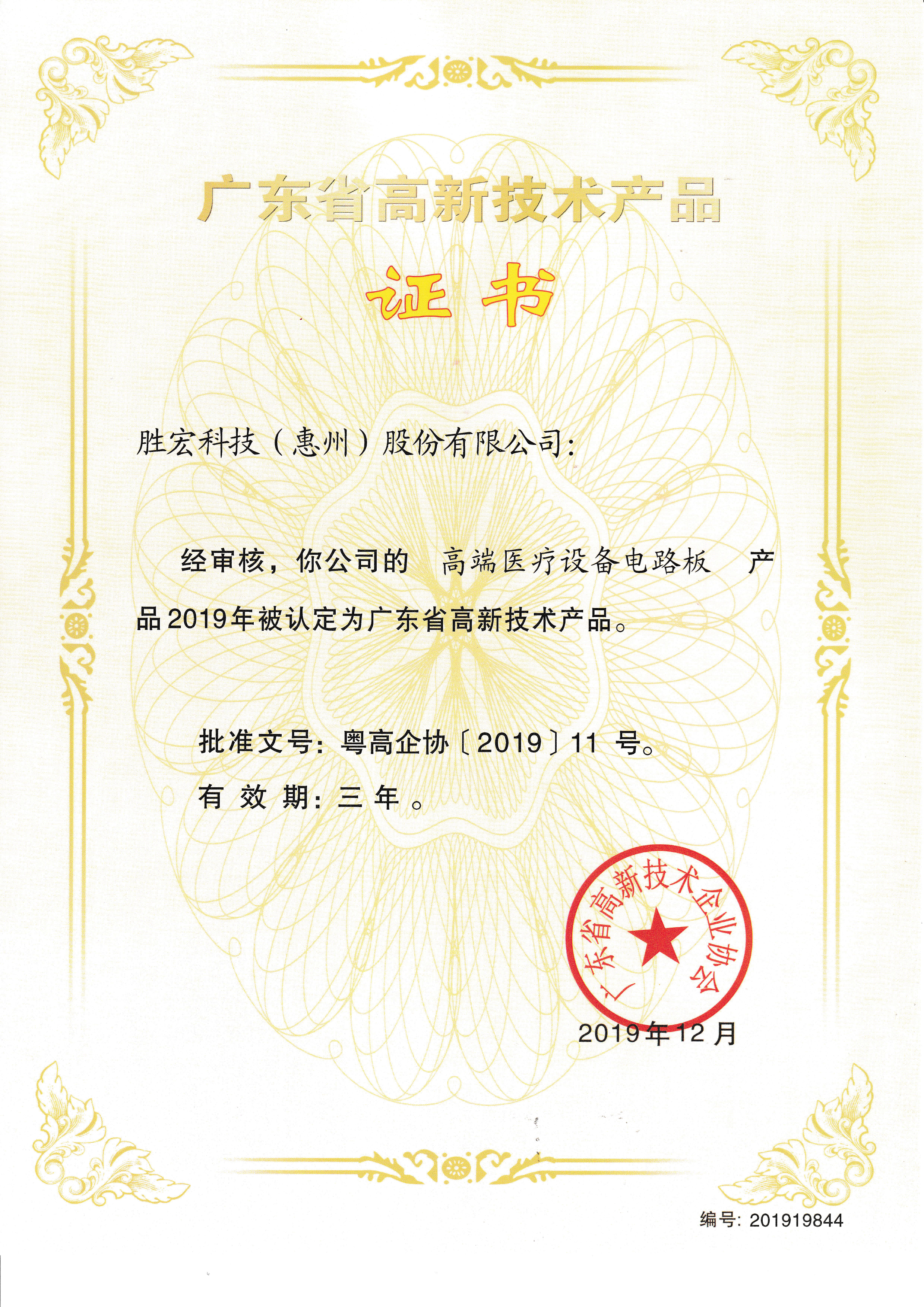 「ハイエンド医療設備プリント基板」中国高新技術製品証明書