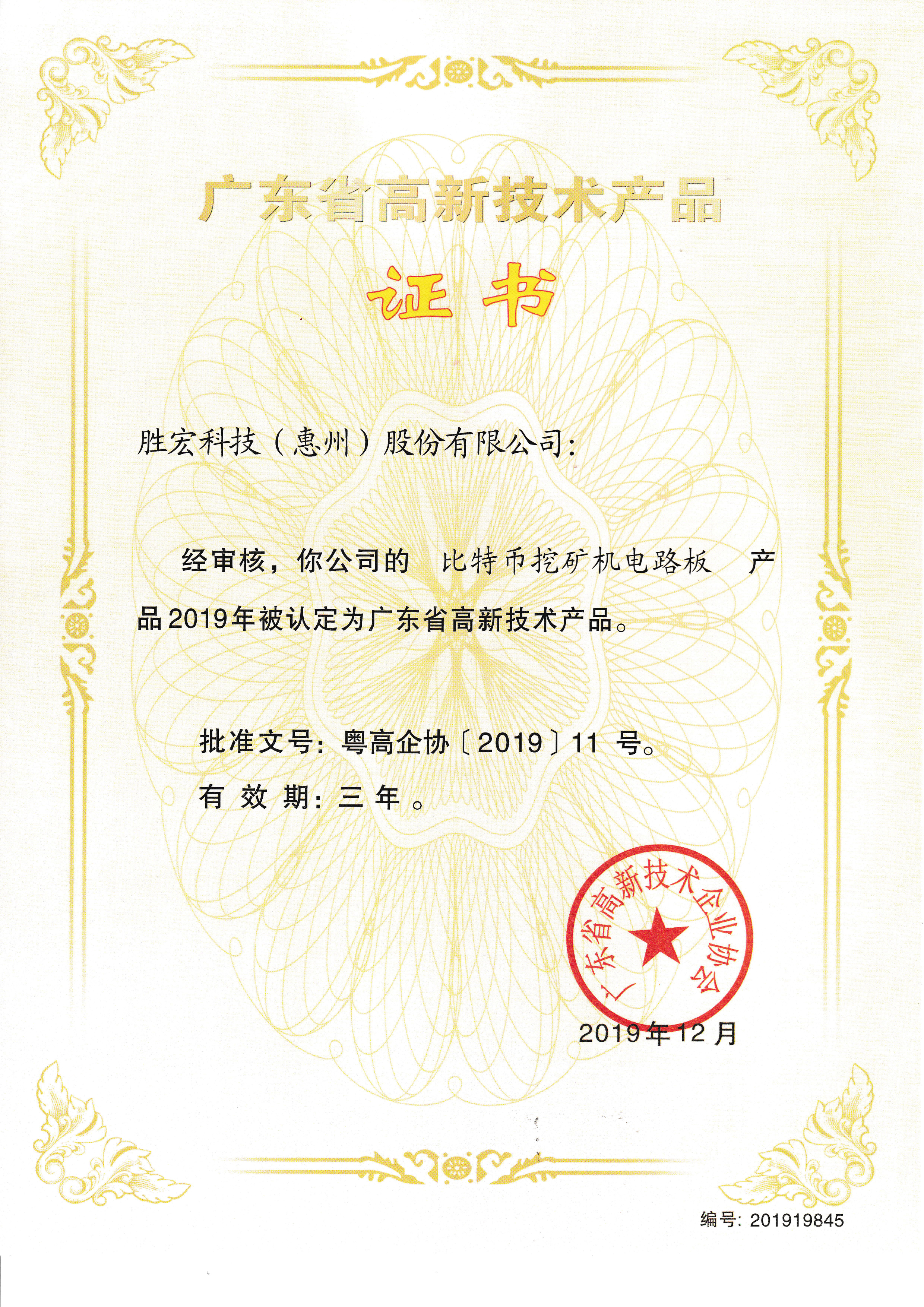 「ビットコイン掘削機械電気プリント基板」中国高新技術製品証明書