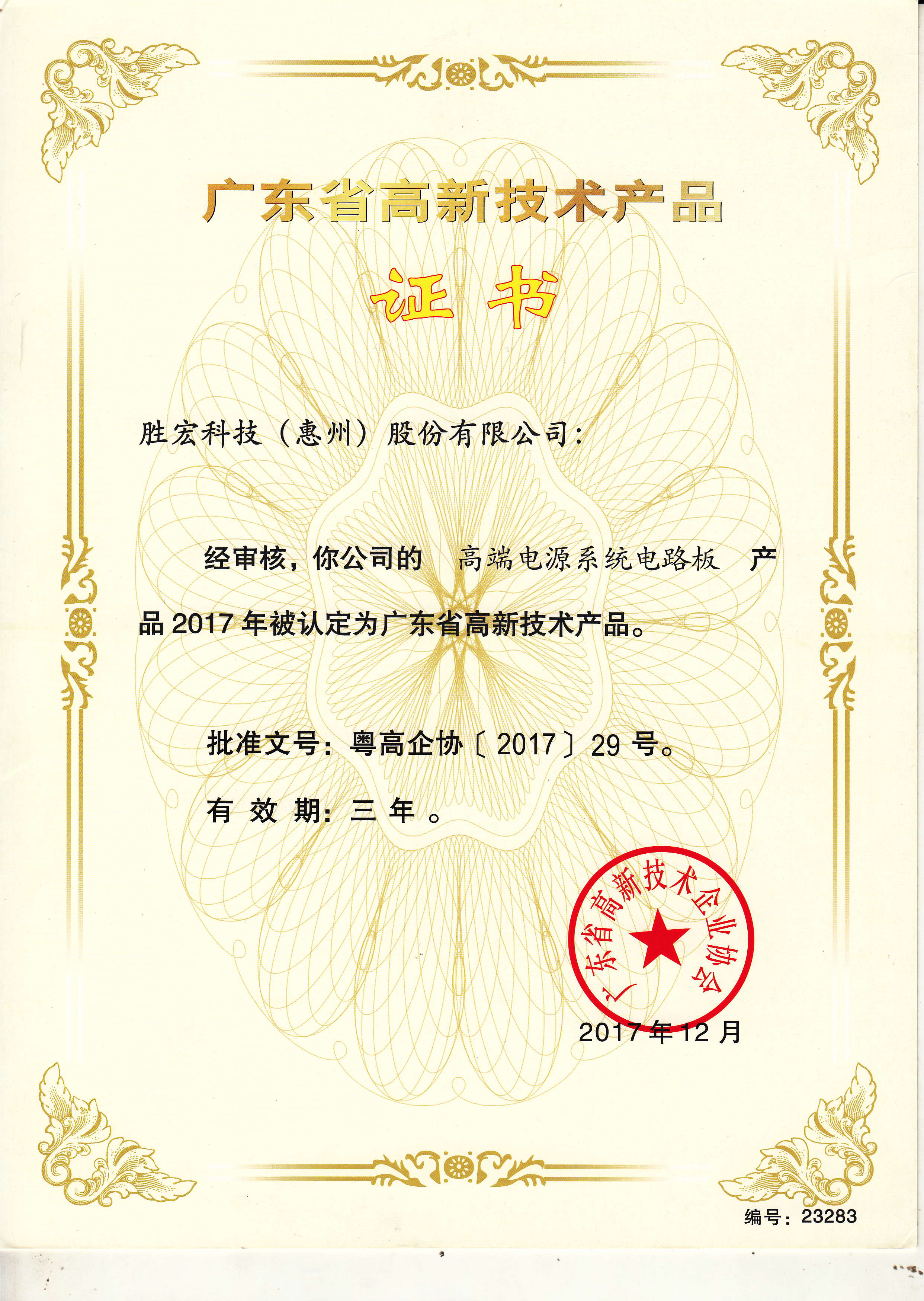 「ハイエンド電源システムプリント基板」中国高新技術製品証明書