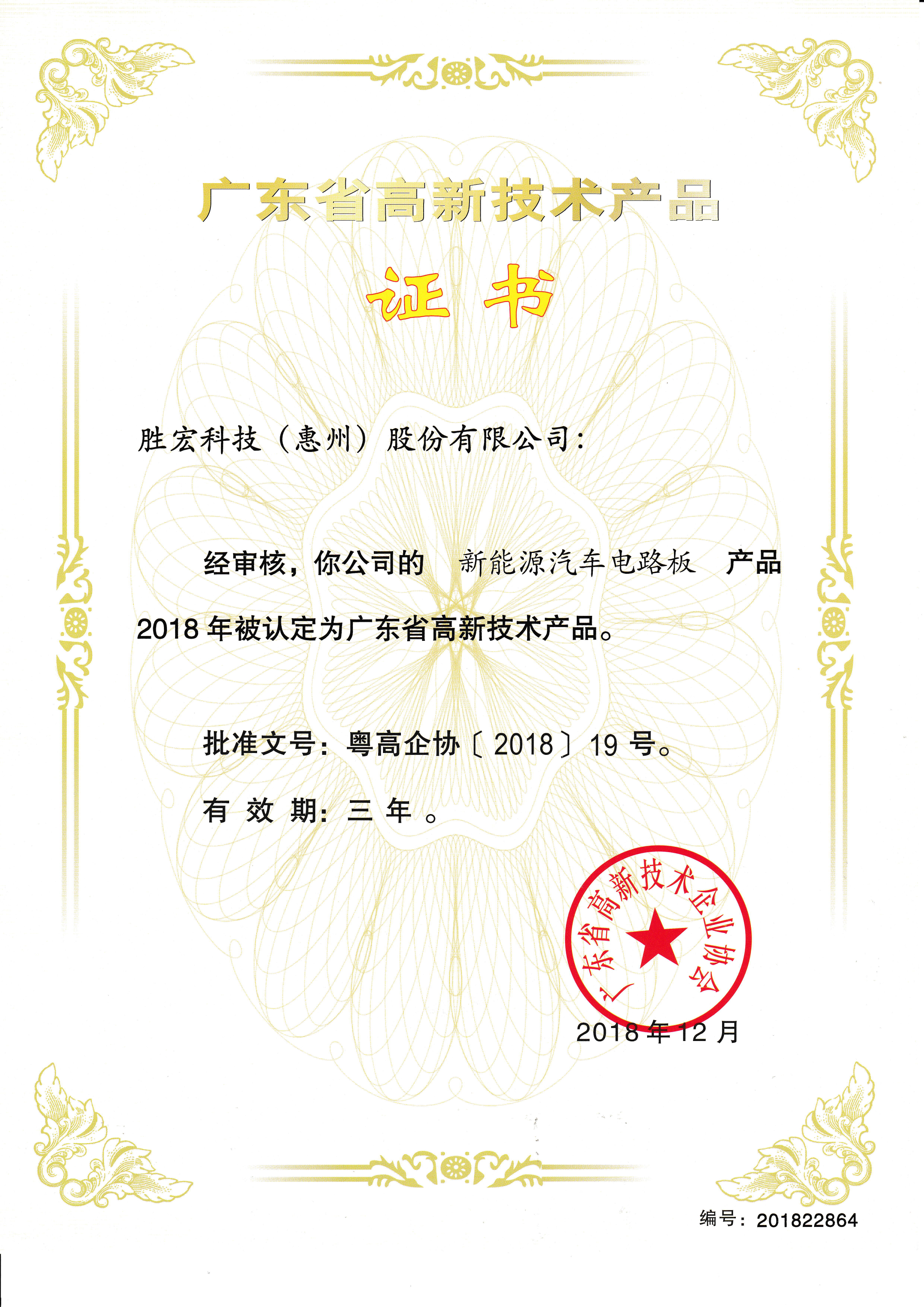 「新エネルギー自動車プリント基板」中国高新技術製品証明書