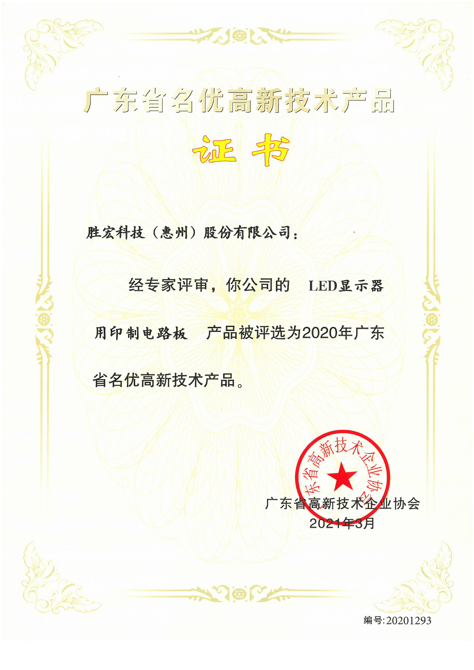 「LEDディスプレイ用プリント基板」中国名優高新技術製品証明書