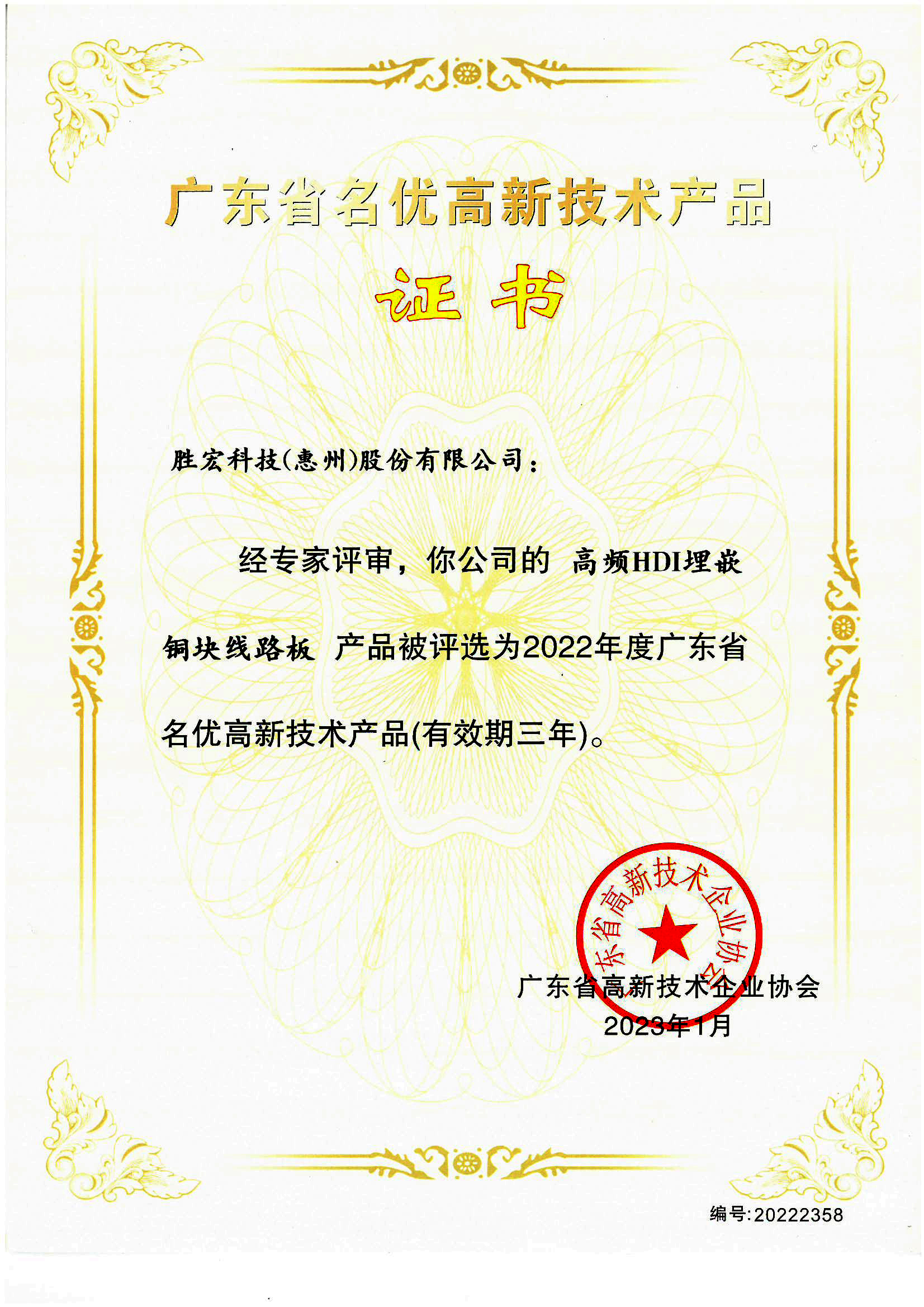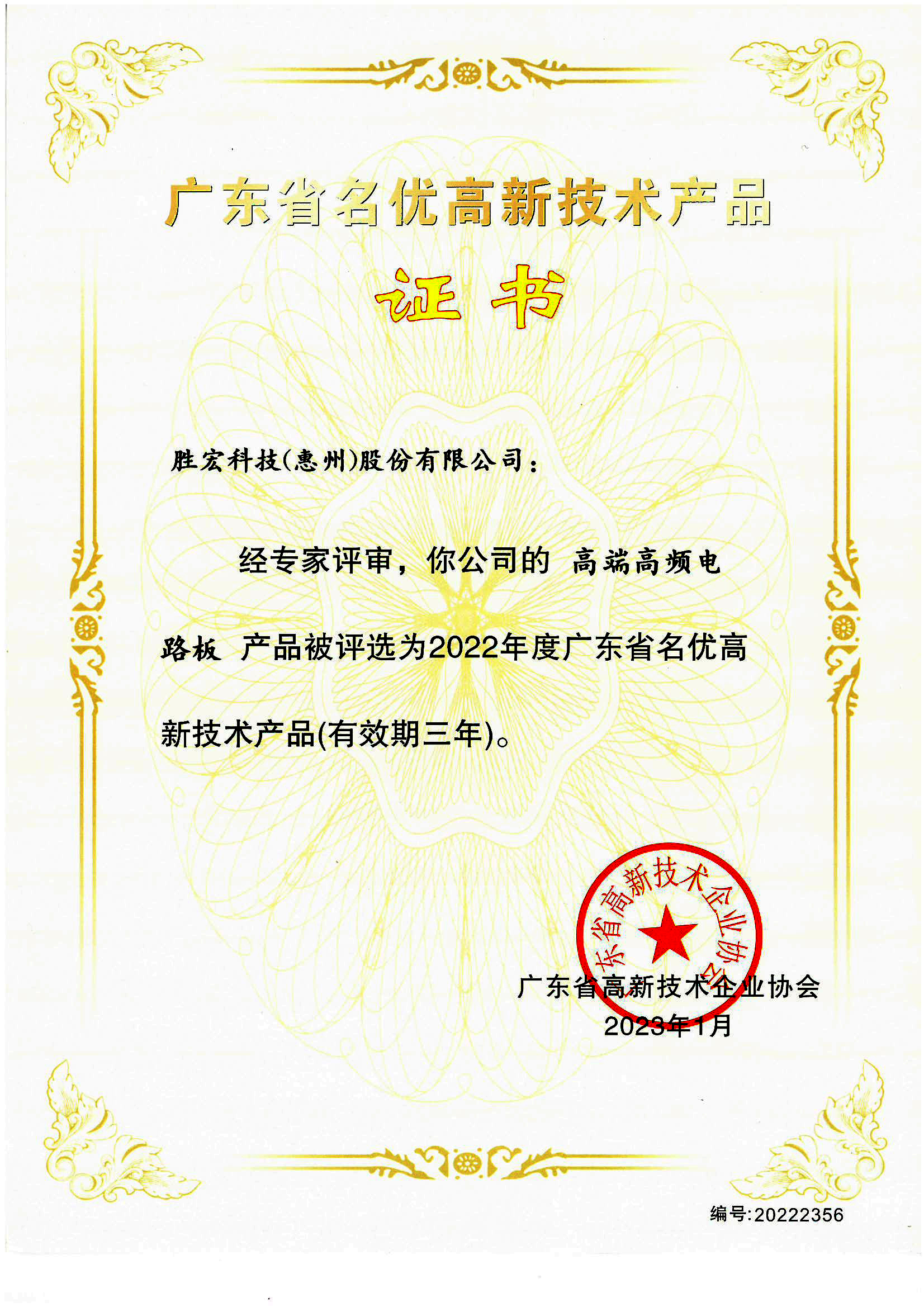 「ハイエンド高周波プリント基板」中国高新技術製品証明書